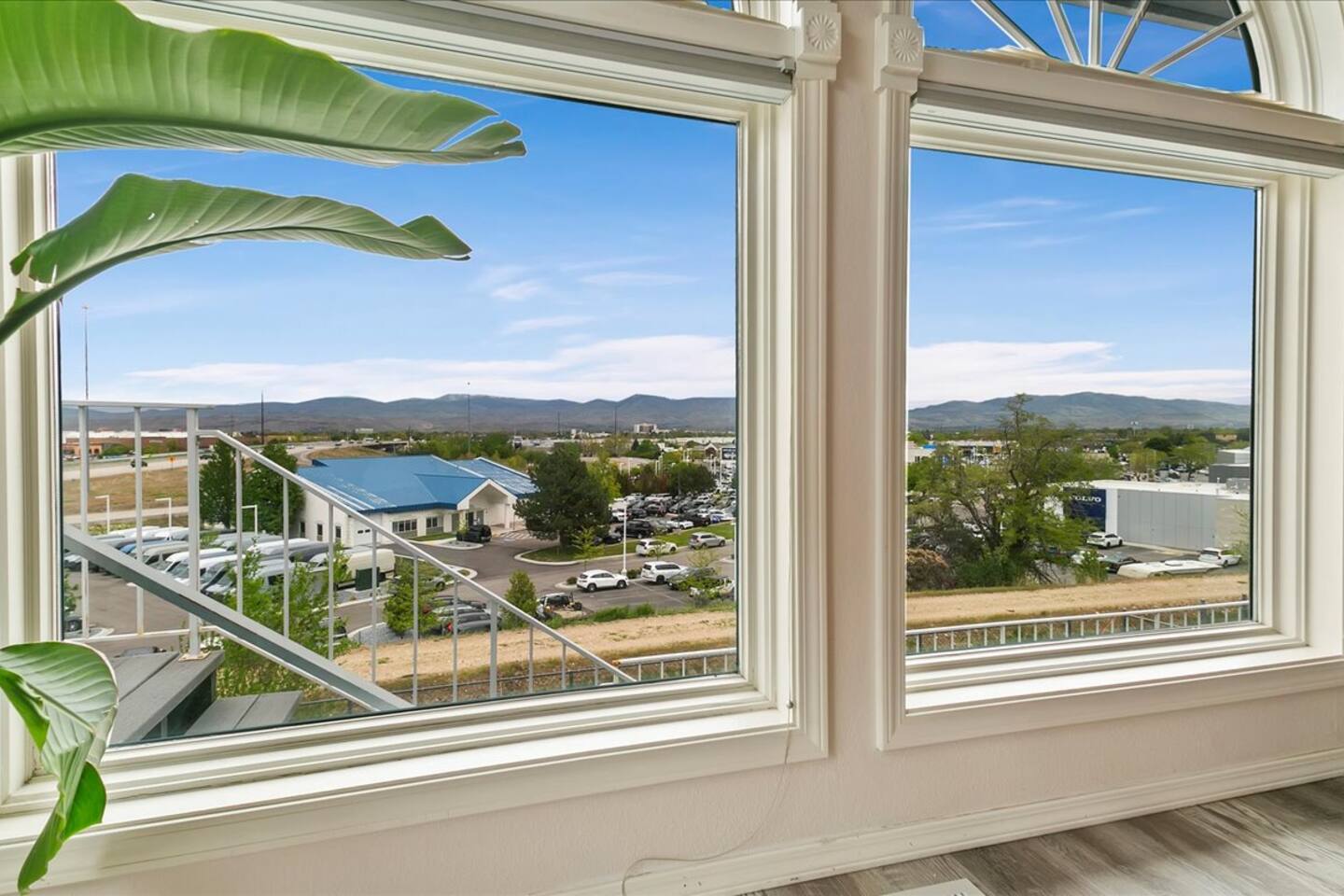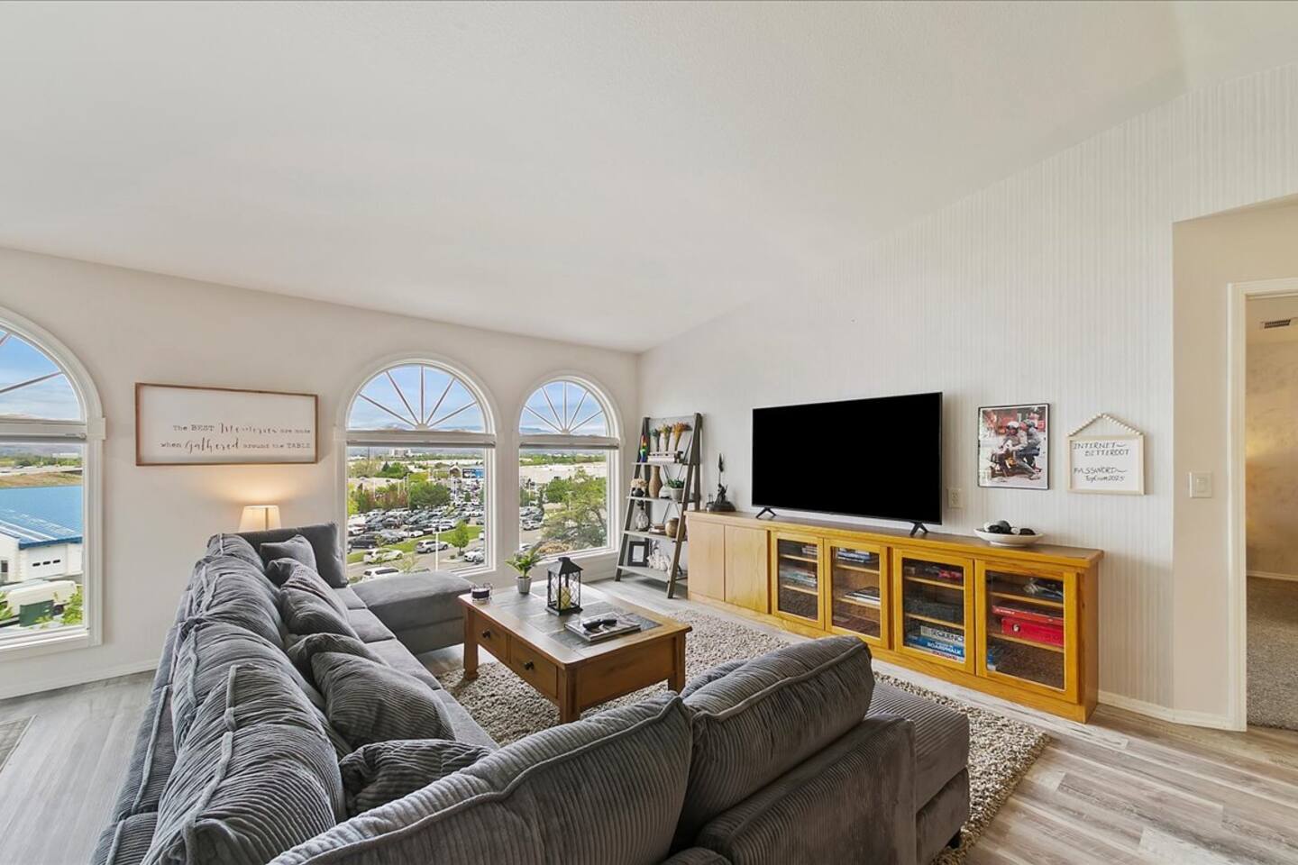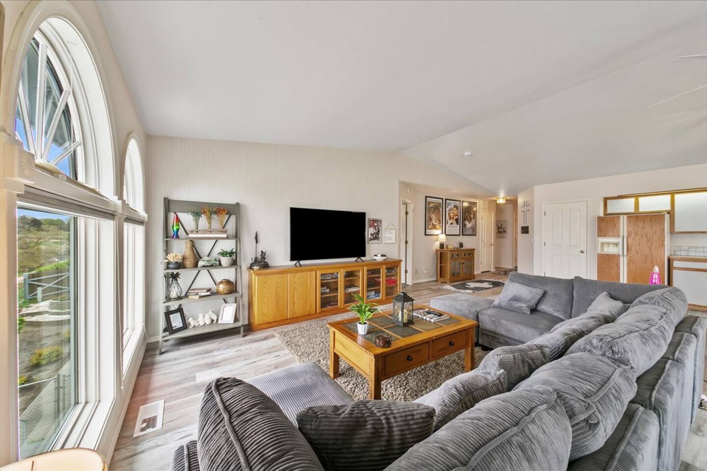 This bright home sports an open concept living space and views of the mountains out of the windows.