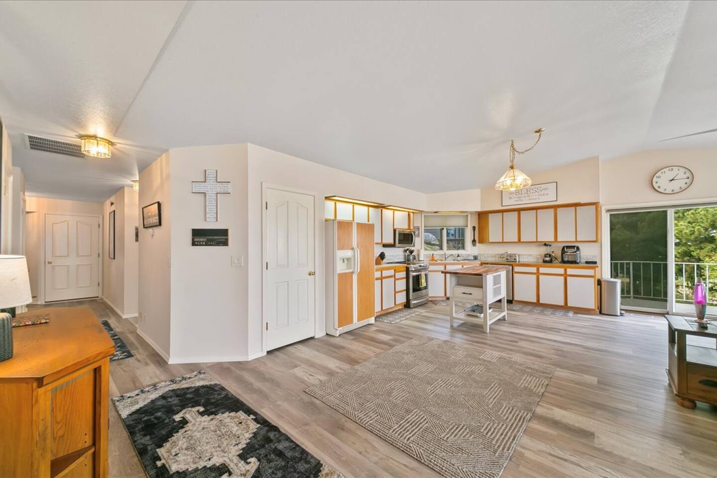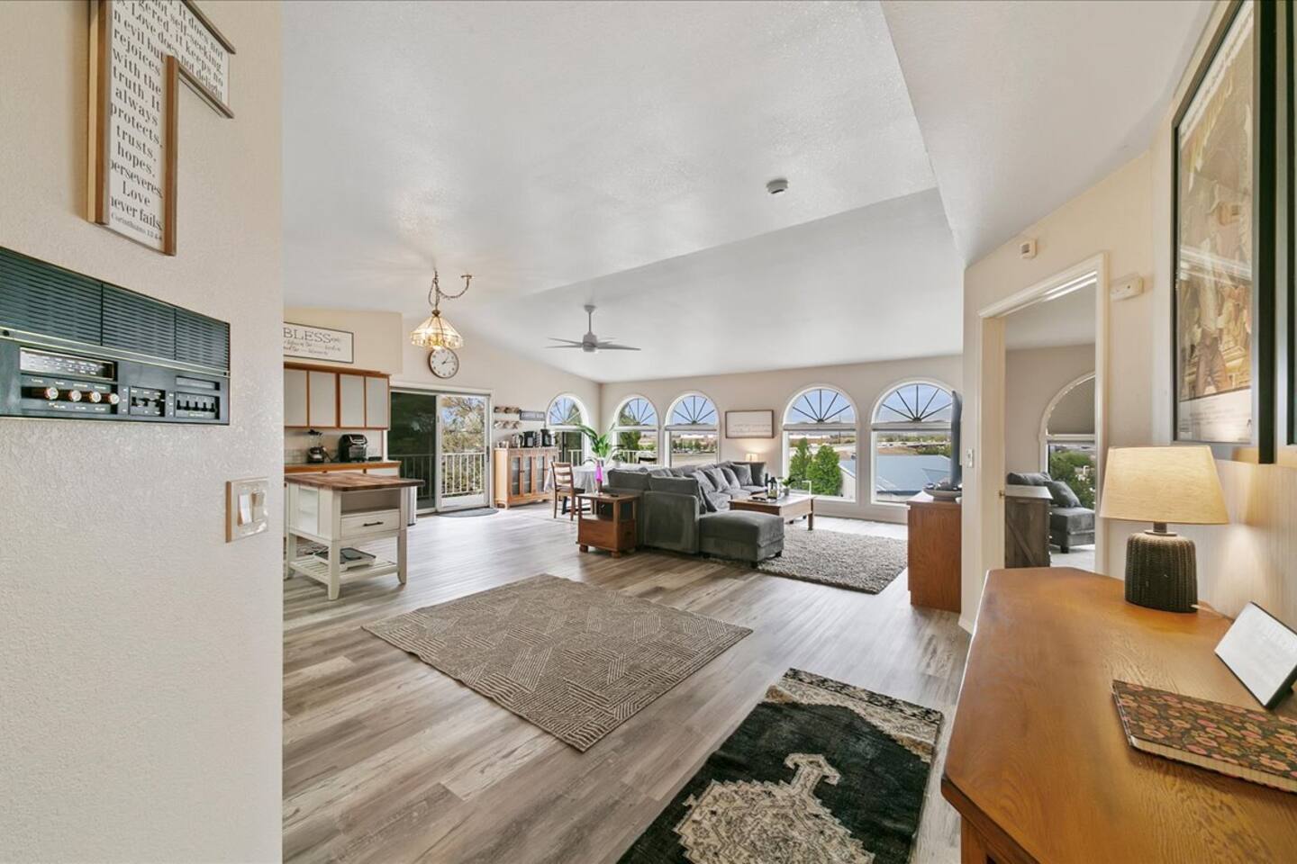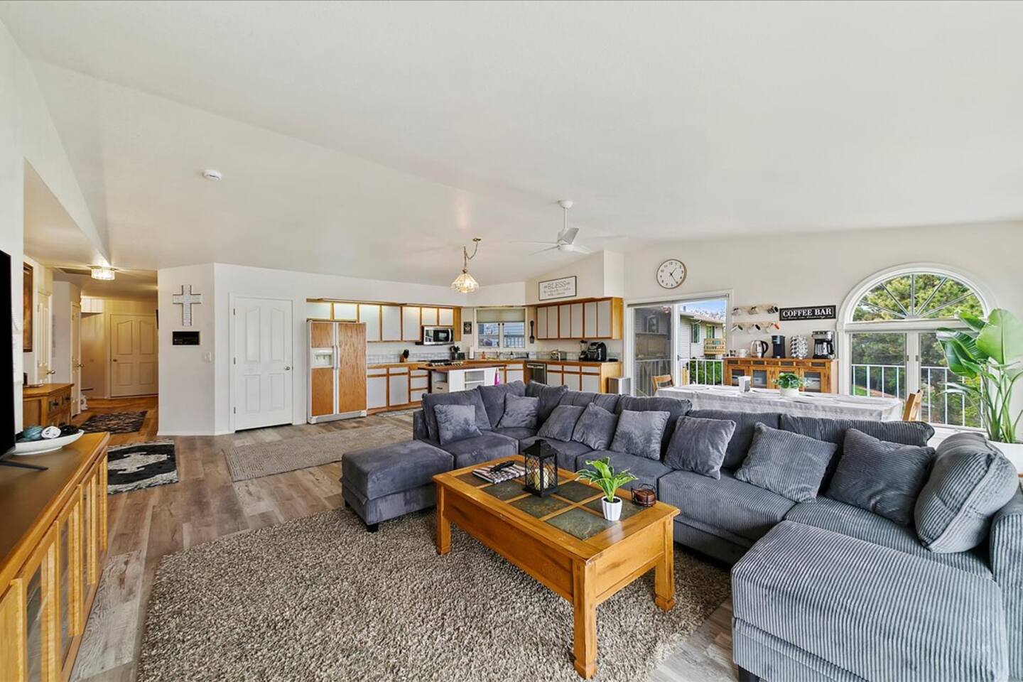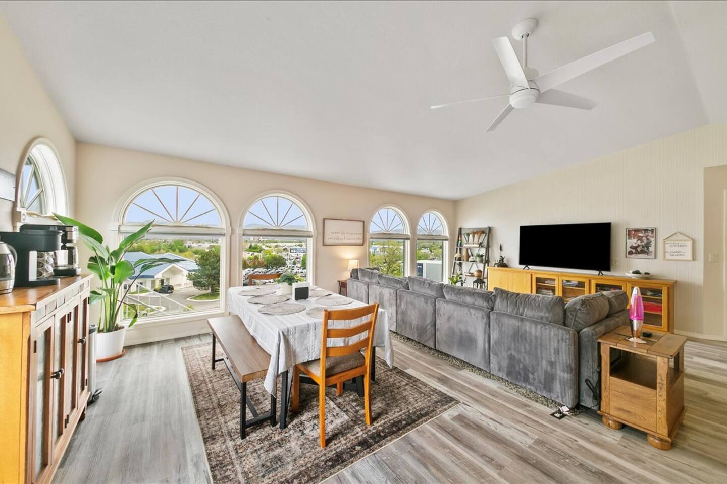 This bright home sports an open concept living space and views of the mountains out of the windows.