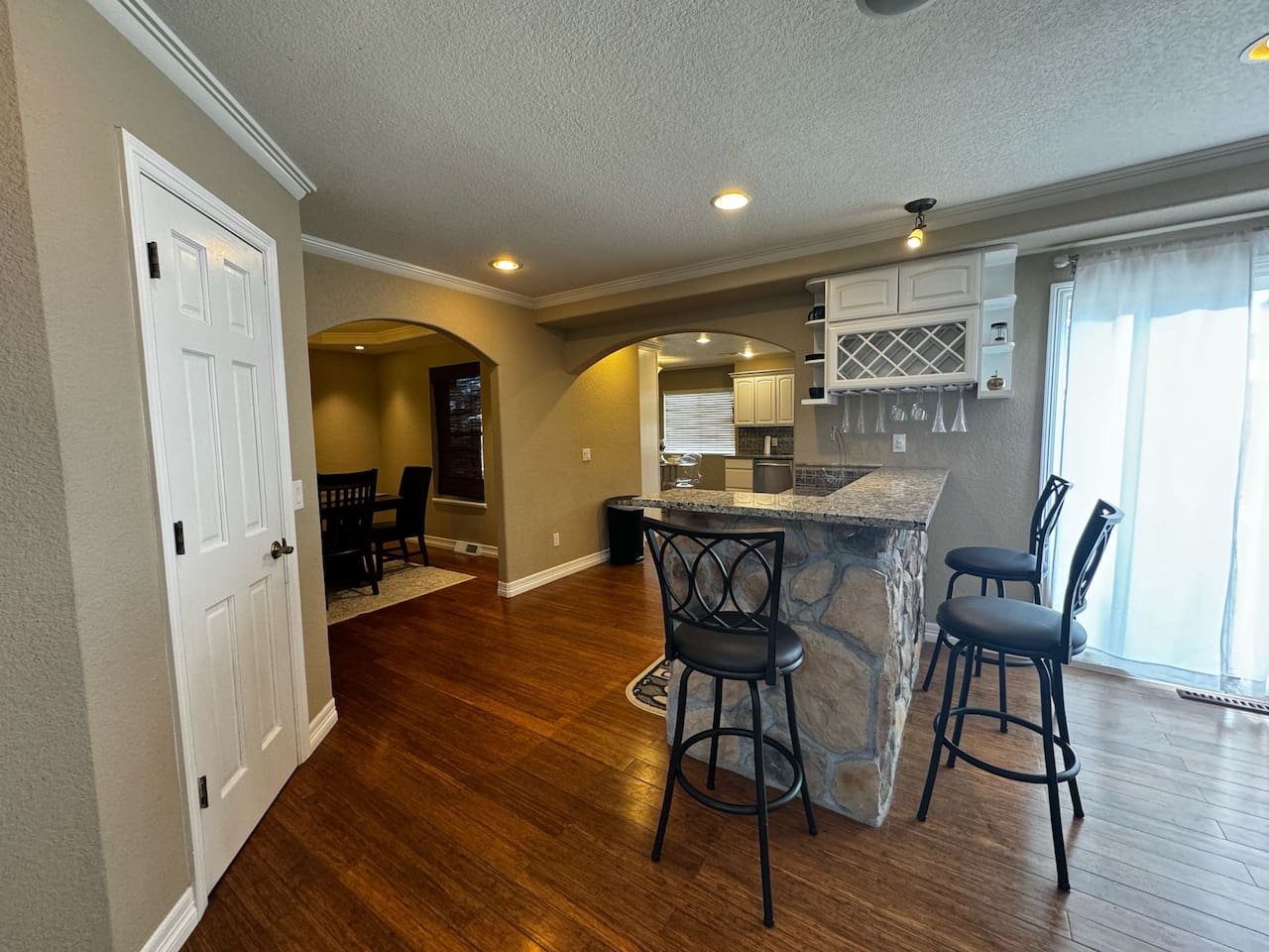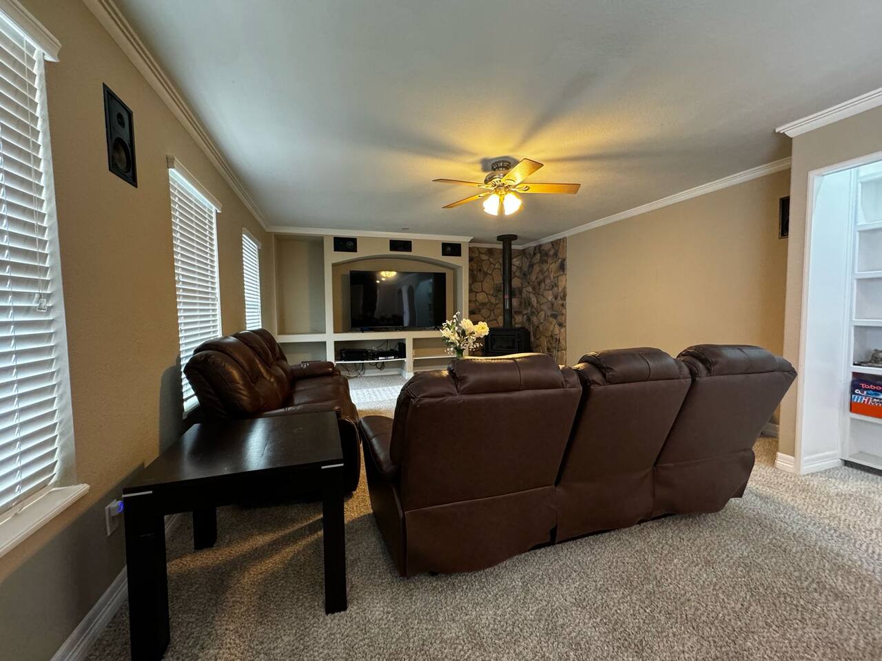 Gather in the spacious family room with a 75” Smart TV, Pioneer surround sound, and beautiful stone veneer accents. Large windows fill the room with natural light, creating a warm, welcoming atmosphere