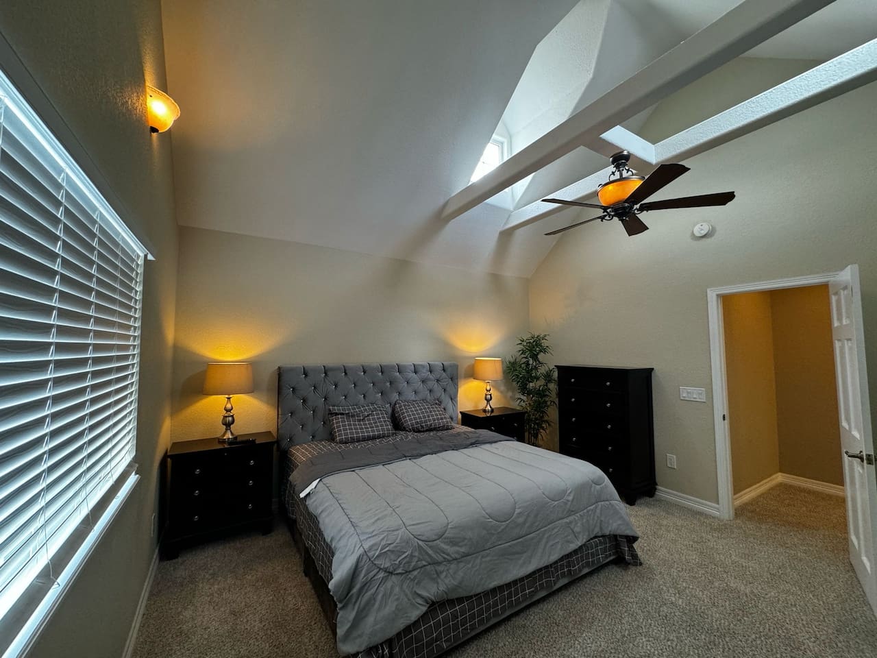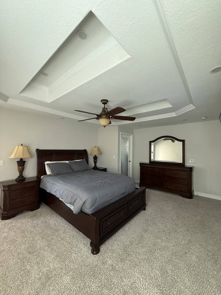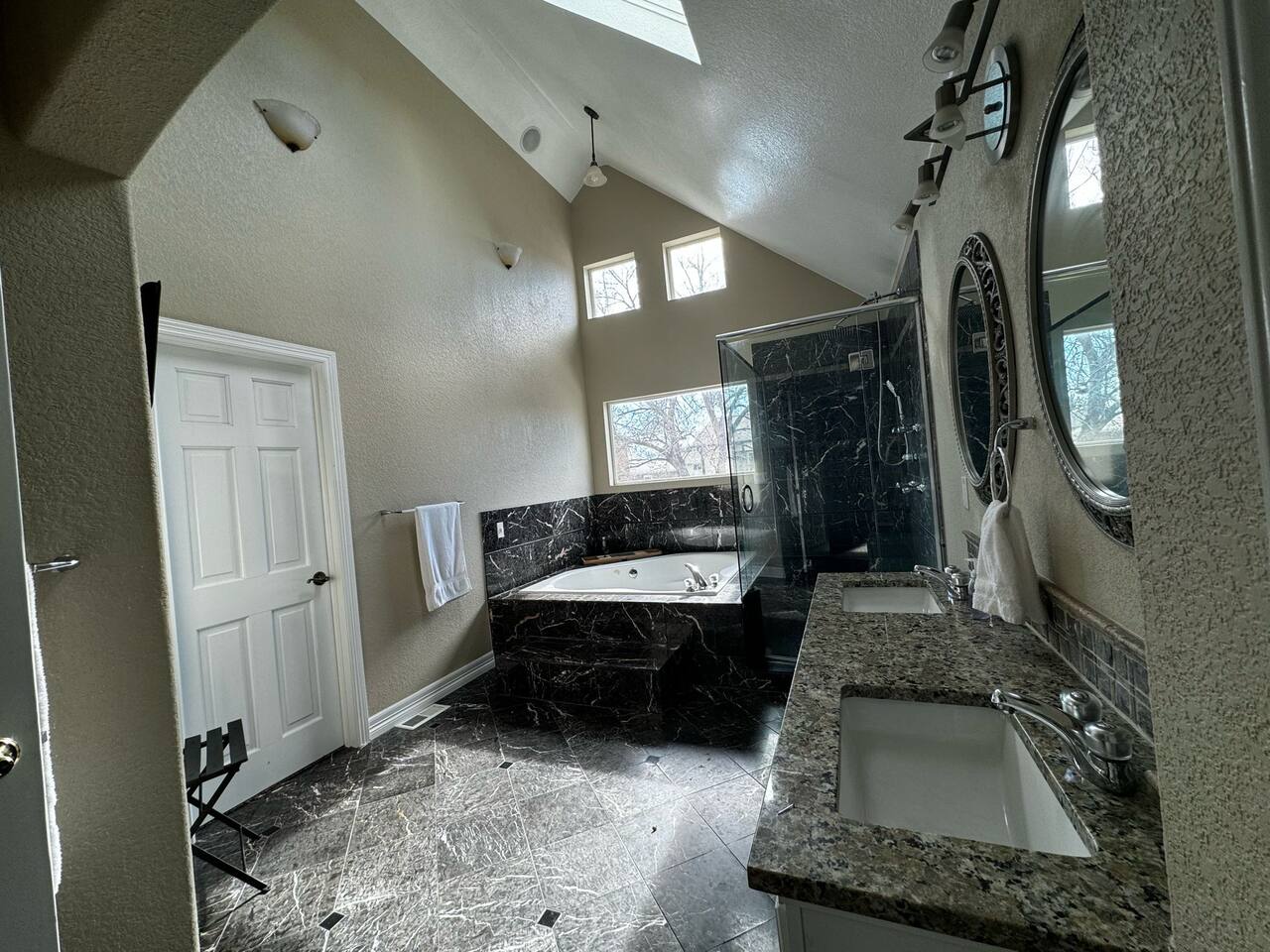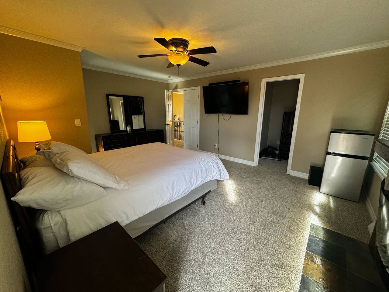 The upstairs include the Primary Suite with a king bed, balcony, and spa-like ensuite with a jetted soaking tub, marble tile, and granite counters. Three more spacious bedrooms and a full bath complete the upper level, totaling four bedrooms upstairs.