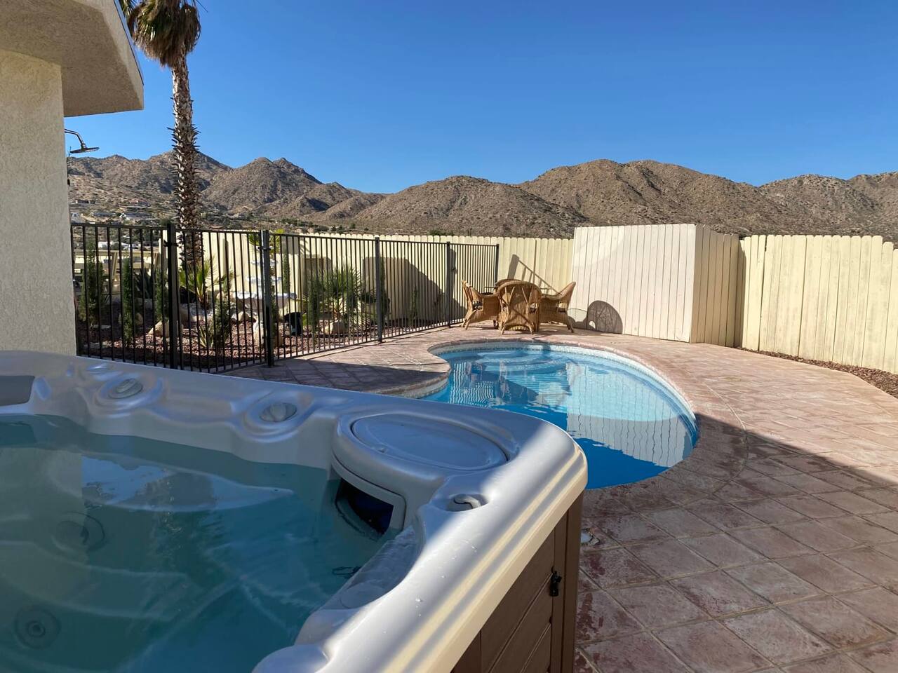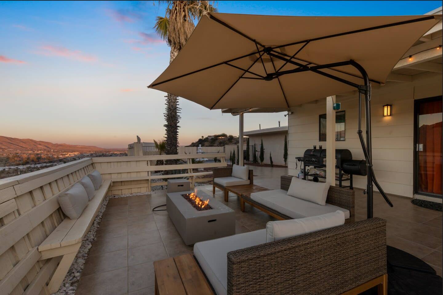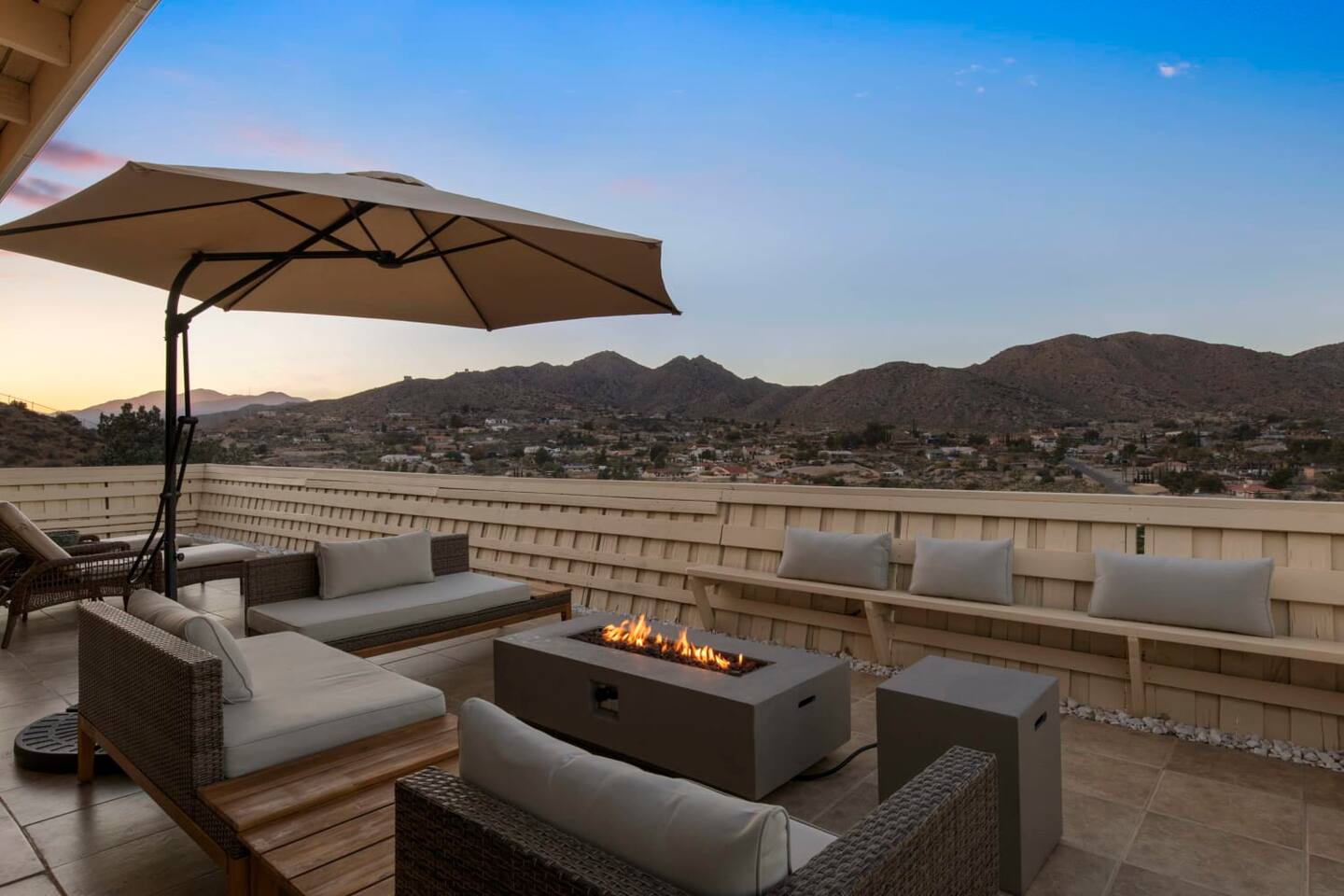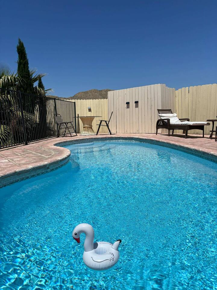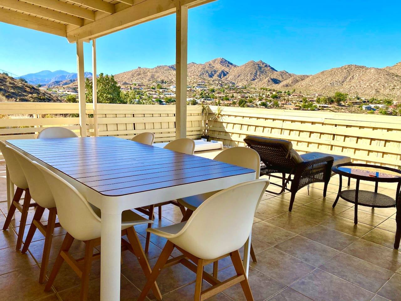 A private, enclosed large outdoor space provides plenty of comfortable seating and multiple areas to gather. Catch some rays by the pool during the day, then grill up some dinner, dine at the outdoor table while you watch the sunset behind the mountain ranges, cozy up by the fire pits for s’mores, and jump into the new 6-person hot tub for a relaxing night of stargazing.
