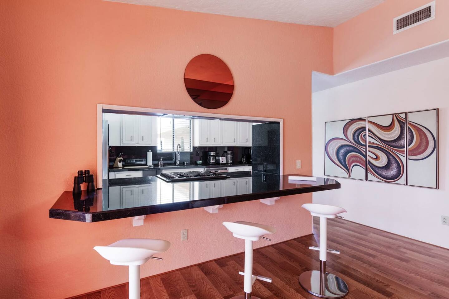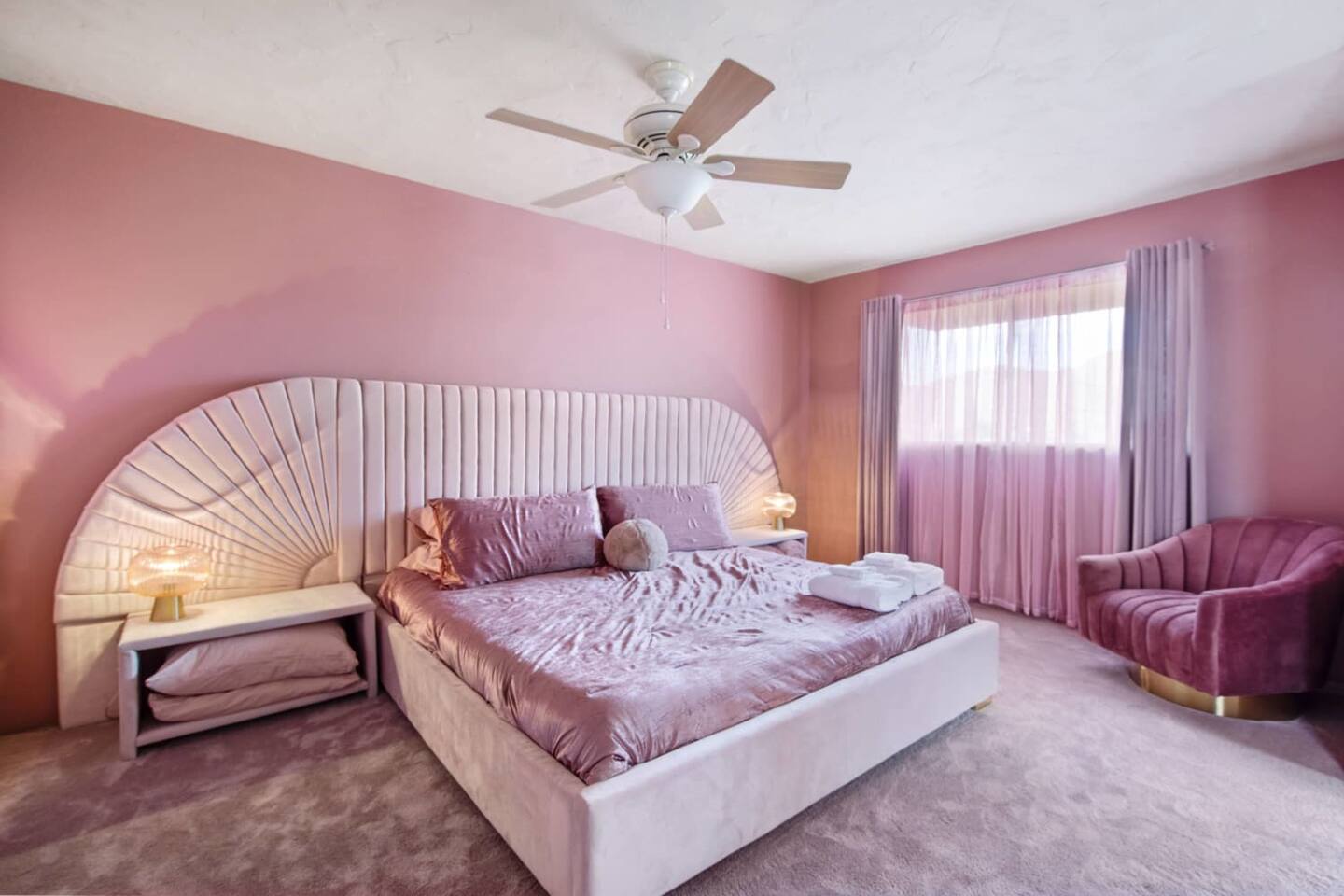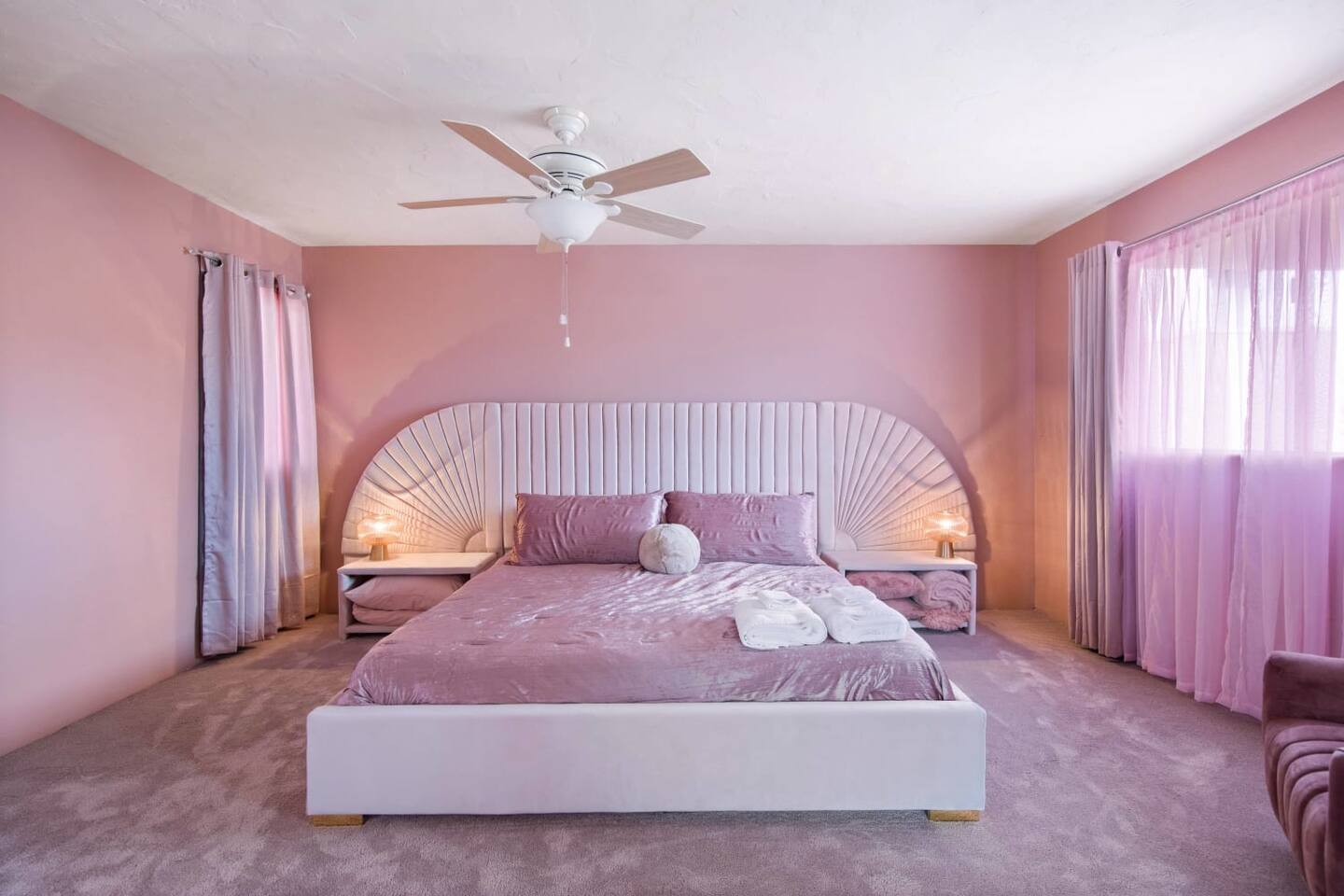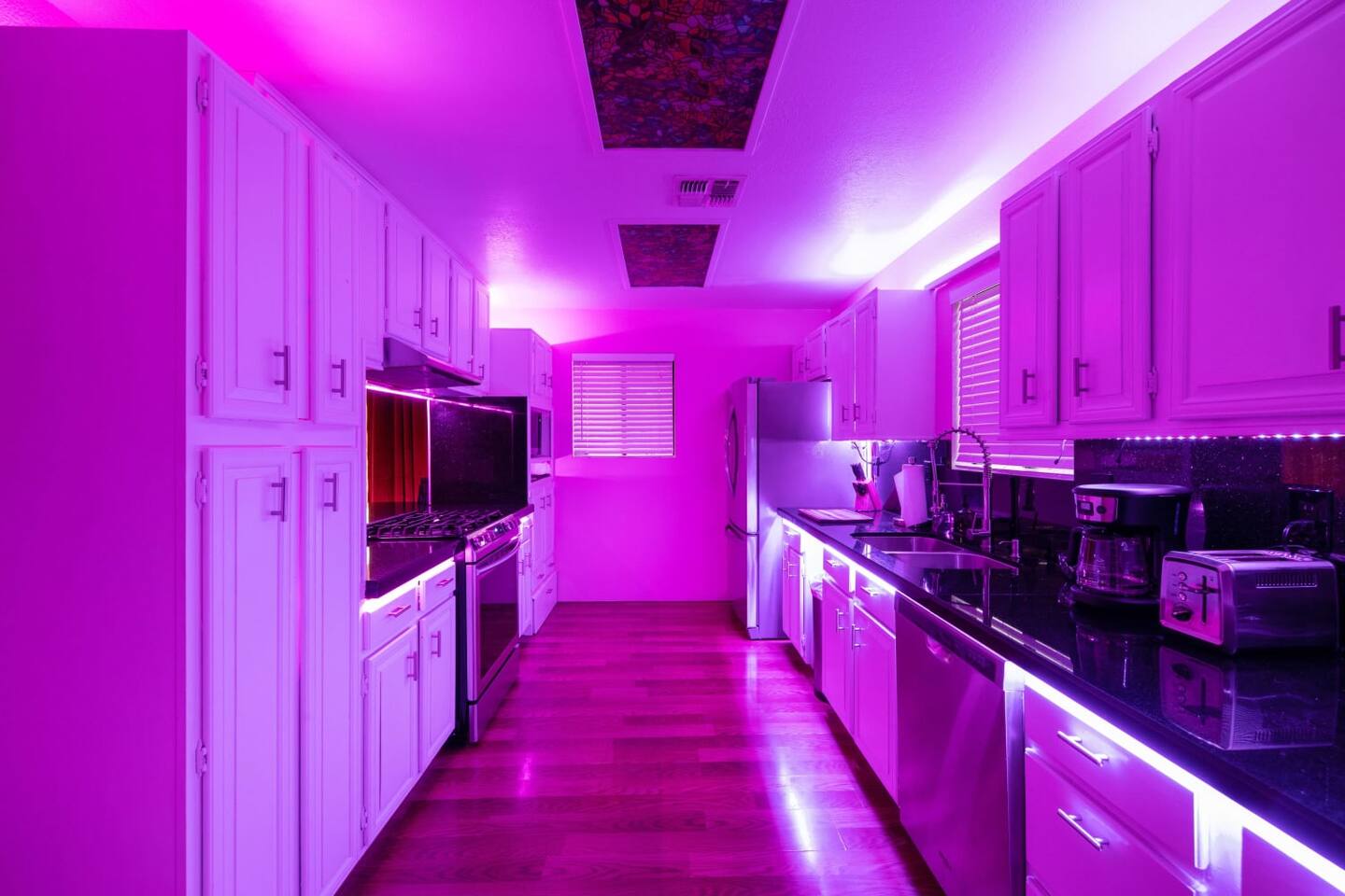 With 4 beds and 2 baths, there’s plenty of space for all your coolest cats to be still and relax, or to take a breather when the Disco Inferno gets too hot. Each room is themed with its own color and mood.