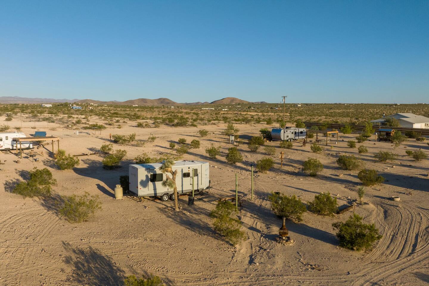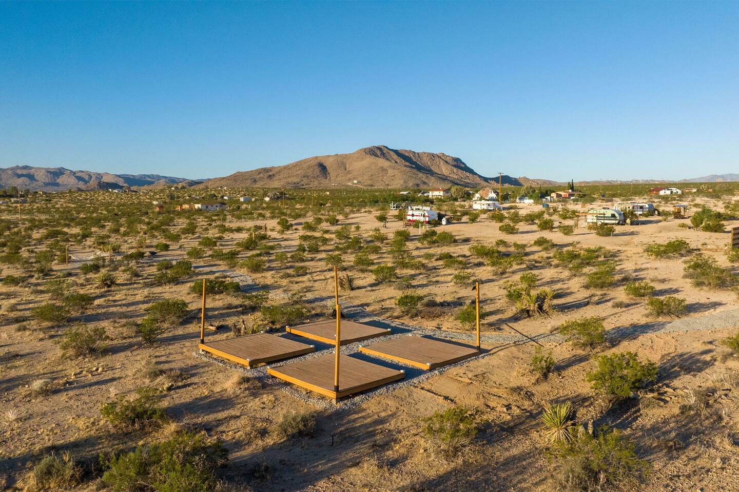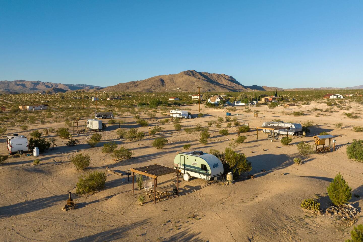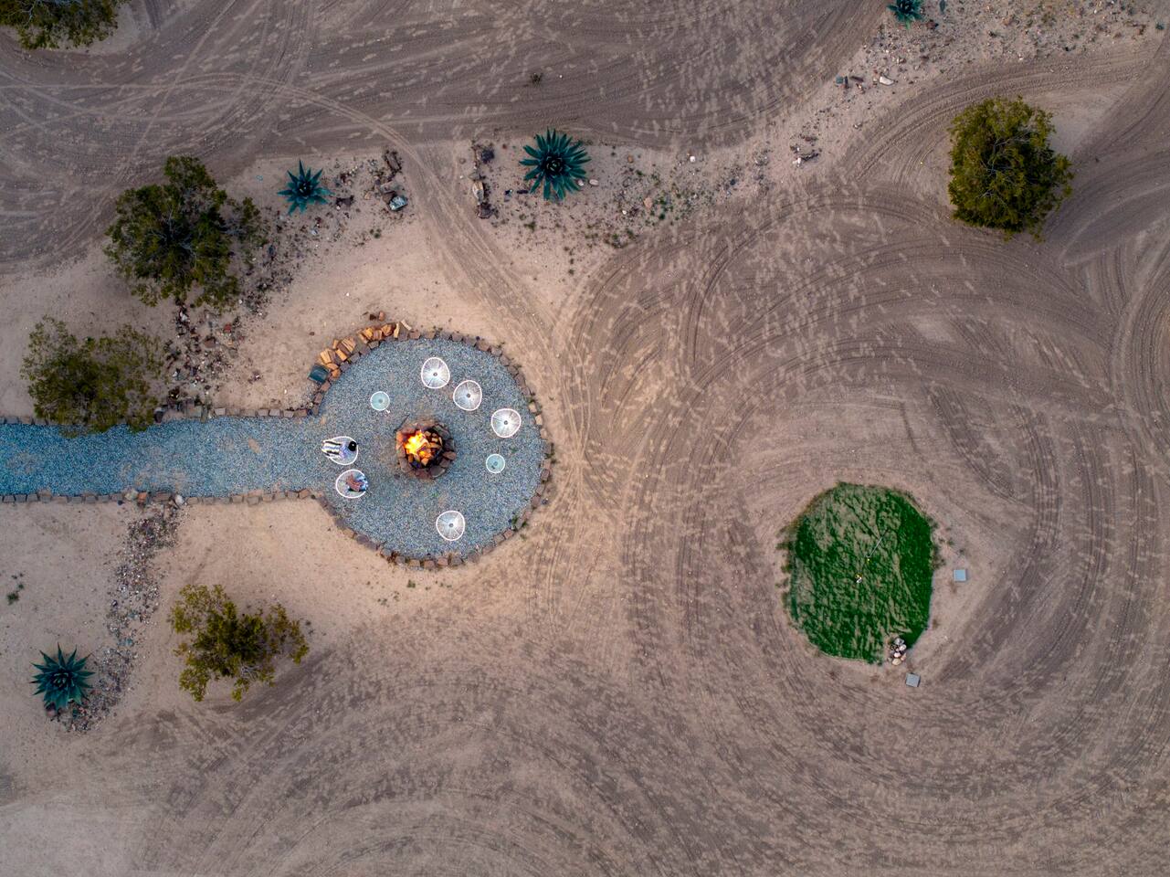 With surprises and photo ops around every corner, this campground is bursting with character and provides something unique for everyone. The stories are made outdoors with acres to roam, a year round hot tub, an outdoor fire pit and lighted horseshoe pits to play under the stars. Enjoy making memories under the most epic sky while taking in the mesmerizing views of the Copper Mountains to the East, Joshua Tree National Park to the South, and the snow capped Big Bear Mountains to the West. You’ll feel secluded, yet be centered in the middle of everything that rules in the desert. Like a true ranger, be on the lookout for shooting stars in the clear night skies, spot wildlife during an afternoon hike, or discover your inner-self at our outdoor yoga space -- everything you need is here including plenty of outdoor activities, making it the perfect spot for a family vacation or retreat.